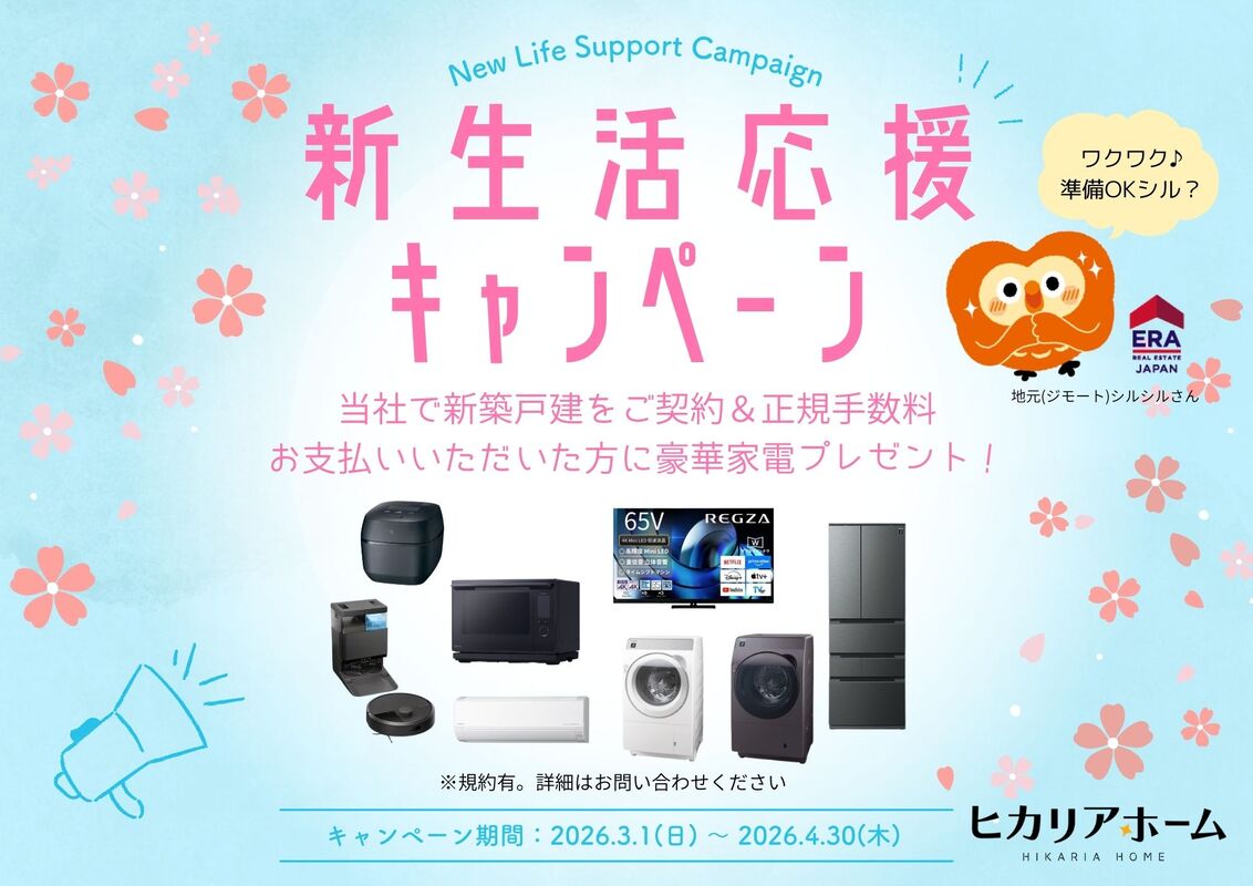 当社にて、新築戸建をご契約&正規手数料お支払いいただいた方に 感謝をこめて豪華家電をプレゼントいたします♪ 期間:2026年3月1日~4月30日 ※規約有。詳細は担当者または当社までお問合せください。
