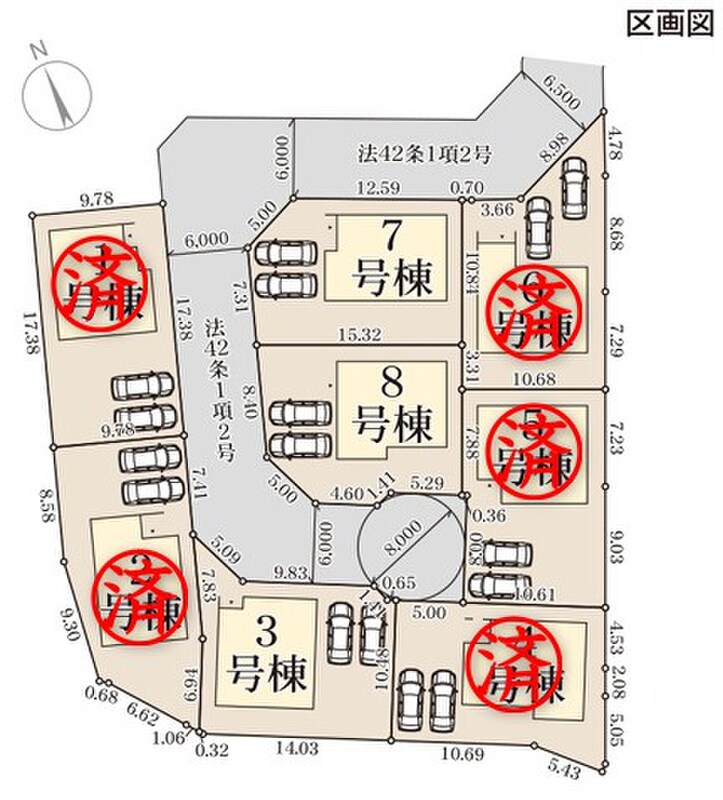 | 駐車場 | 2台 | 道路の幅員 | 道路幅:6m・6.5m、アスファルト舗装、中央側6m公道、6号棟北西側6.5m公道 |