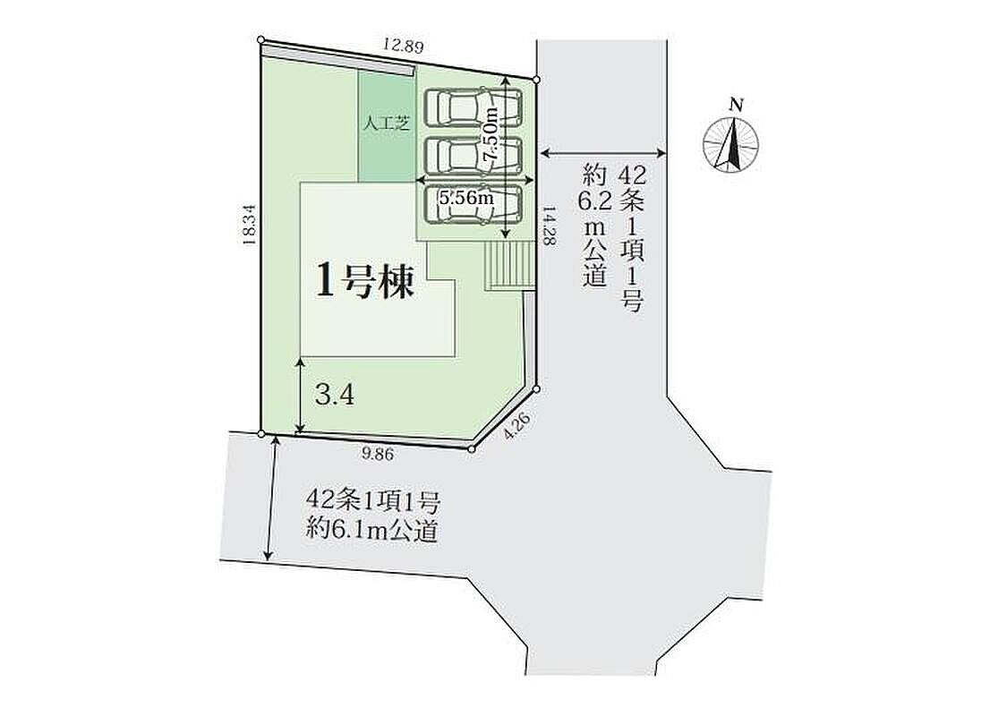 | 駐車場 | 3台 | 道路の幅員 | 道路幅:6.1m・6.2m、アスファルト舗装、南側約6.1m公道、東側約6.2m公道 |