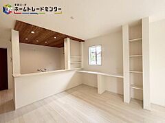 リビングには季節の小物や日用品を置ける棚と、カウンターがあります♪