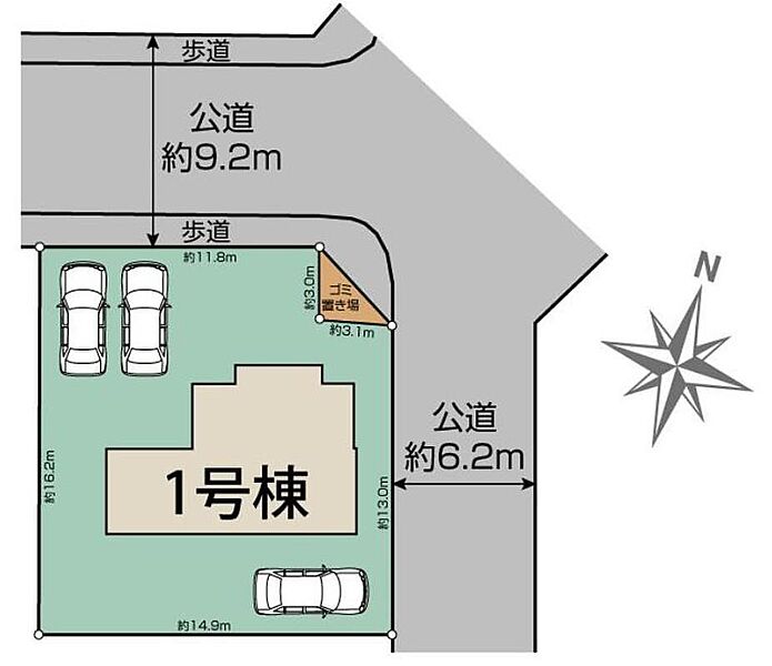 | 駐車場 | 3台 | 道路の幅員 | 道路幅:9.2m、アスファルト舗装、北側9.2m公道、東側6.2m公道 |