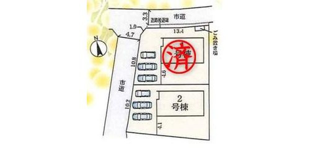 | 駐車場 | 3台(車種による) | 道路の幅員 | 道路幅:3.3m・4.7m、アスファルト舗装、北側3.3m市道、西側4.7m市道 |