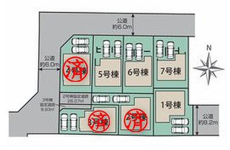 | 駐車場 | 2台 | 道路の幅員 | 道路幅:6m、アスファルト舗装、北側6m公道、西側6m公道、東側8.2m公道 |