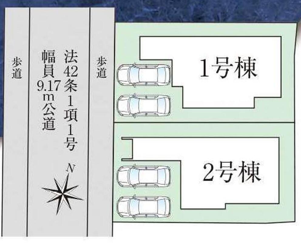 | 駐車場 | 2台(並列駐車) | 道路の幅員 | 道路幅:9.1m、アスファルト舗装、西側9.1m公道 |