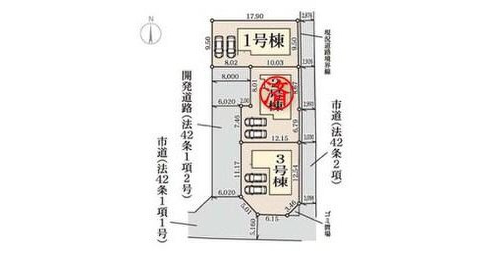 | 駐車場 | 2台 | 道路の幅員 | 道路幅:5.1m、アスファルト舗装、南側5.1m公道、東側2.9m公道、中央側6m公道 |
