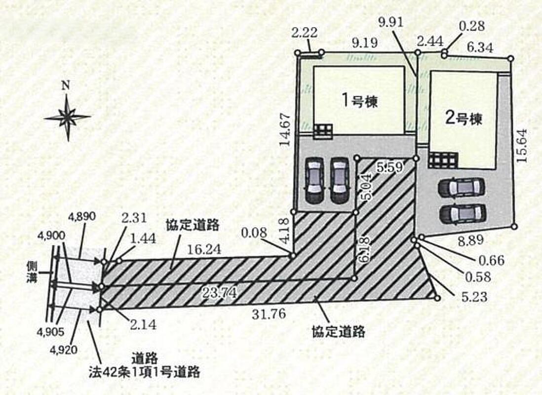 | 駐車場 | 2台 | 道路の幅員 | 道路幅:6m、アスファルト舗装、東側6m公道 |