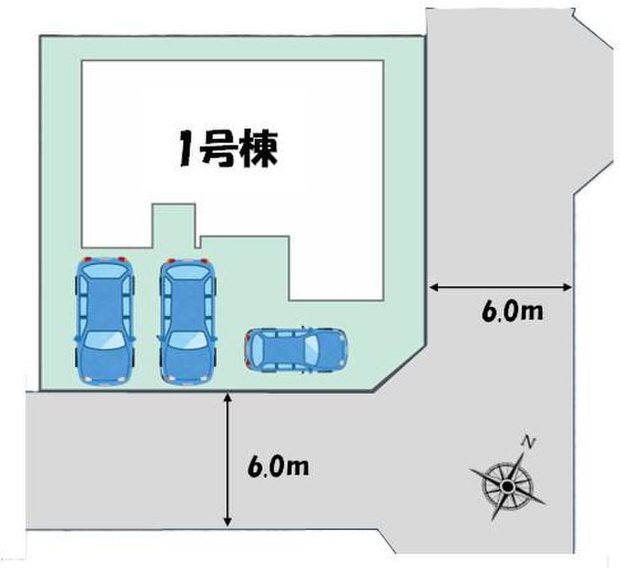| 駐車場 | 3台(車種による) | 道路の幅員 | 道路幅:6m、アスファルト舗装、東側約6.0m市道、南側約6m市道 |