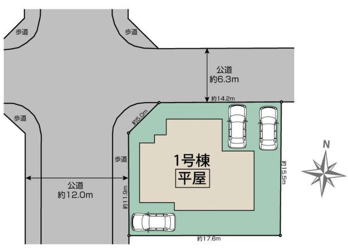 | 駐車場 | 3台(車種によります) | 道路の幅員 | 道路幅:12m、アスファルト舗装、西側12.0公道(歩道含)、北側6.3m公道 |