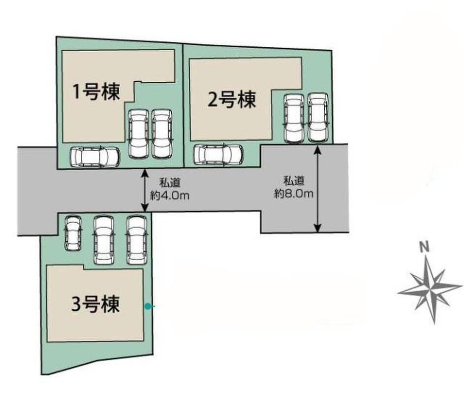 | 駐車場 | 3台 | 道路の幅員 | 道路幅:4m、アスファルト舗装、南4.0m私道、北4.0m私道 |