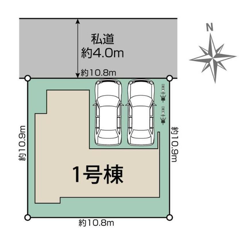 | 駐車場 | 2台 | 道路の幅員 | 道路幅:4m、アスファルト舗装、北側4.0m私道 |