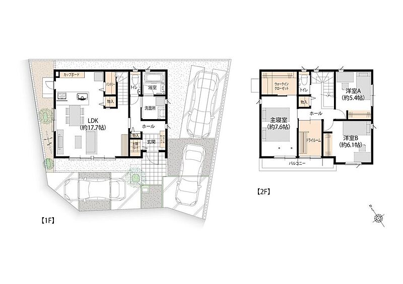【選りすぐりの間取りプランをパッケージ化】LDKは約17.7帖!二面採光で明るい空間です。バルコニー前にはドライルームを設置!雨の日も快適です。パントリー、土間クローク、WICなど収納充実。
