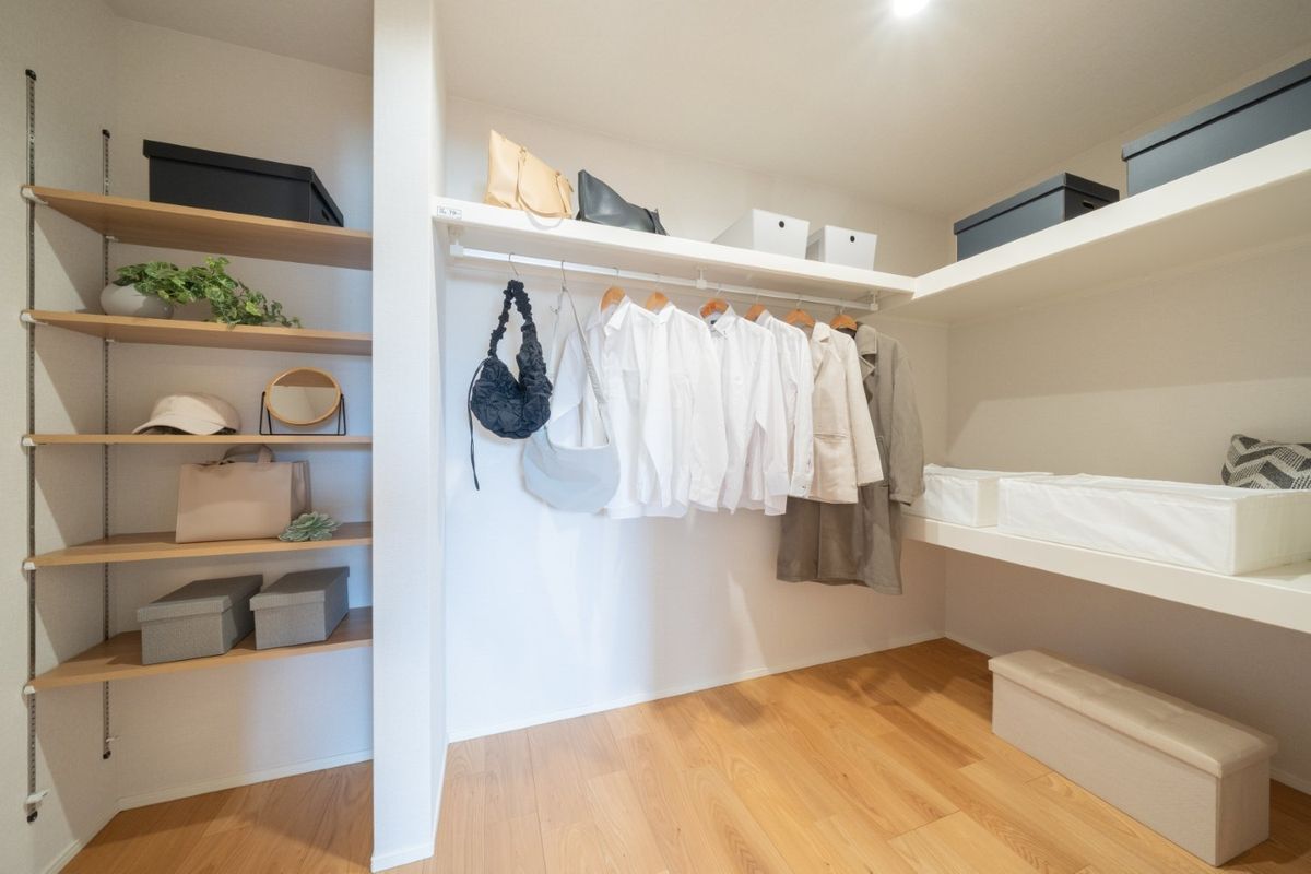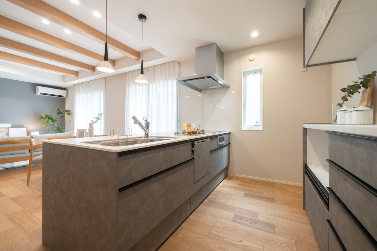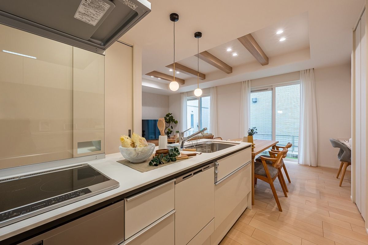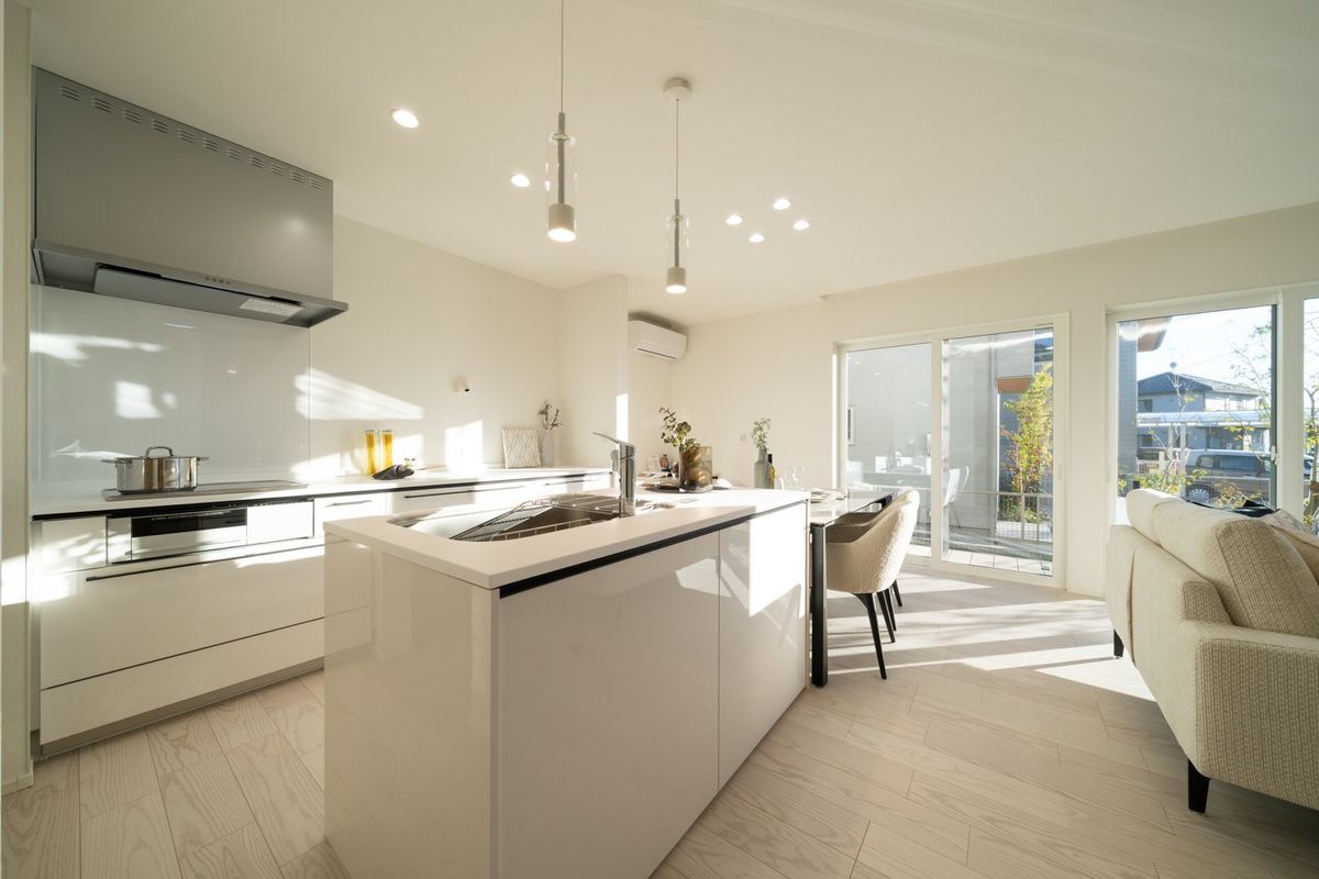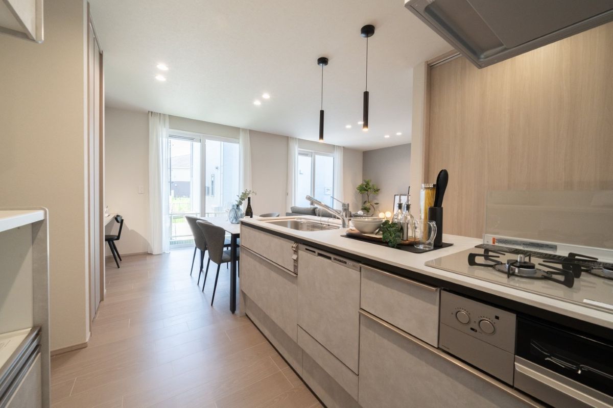 リビングを見渡せるカウンターキッチンで家族間のコミュニケーションが自然と増えます。ファミリークロークやウォークインクローゼット、土間クロークなど暮らしを豊かにする充実の収納設備を採用!