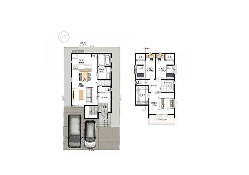 | 建物面積 | (2号地)89.42m2 / 27.04坪 (登記) | 土地面積 | (2区画)110.36m2~110.40m2 / 33.38坪~33.39坪 (登記) |