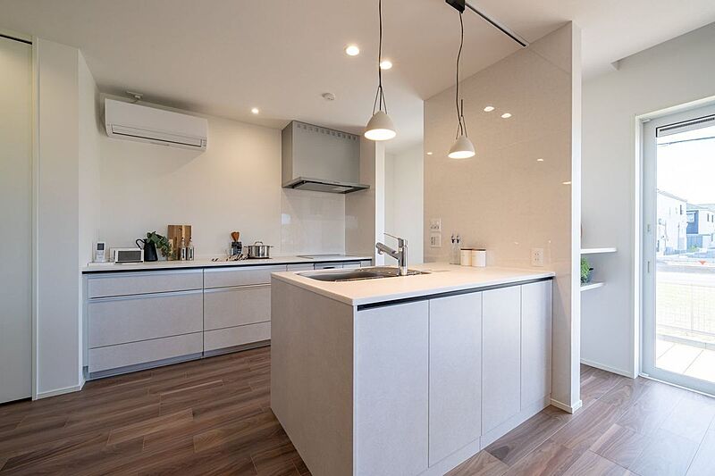 セパレートタイプのキッチンは、ご家族と一緒に調理を楽しめます家族のつながりを感じやすい、リビング・ダイニング・キッチンがひと続きの間取り駐車2台可(車種による)