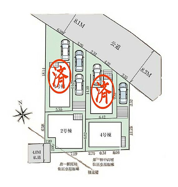 | 建物面積 | 91.48m2(4号棟)~107.43m2(2号棟) | 土地面積 | 91.48m2(4号棟)~107.43m2(2号棟) |