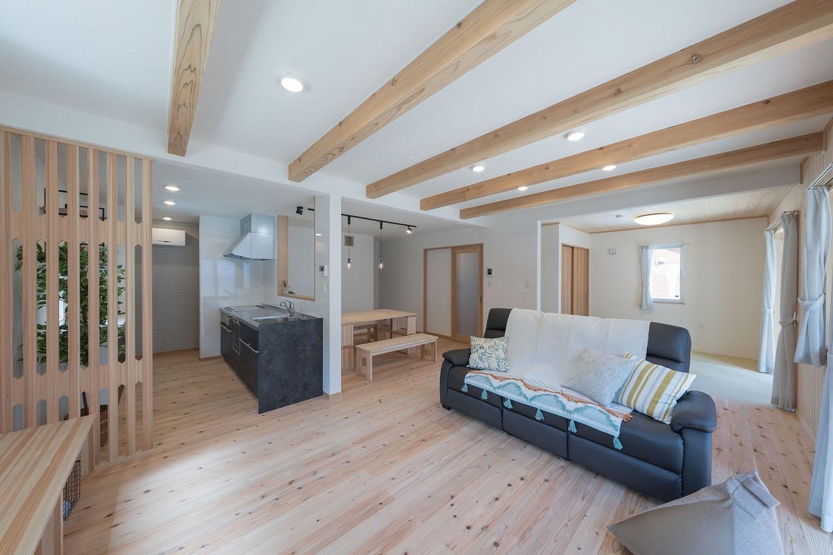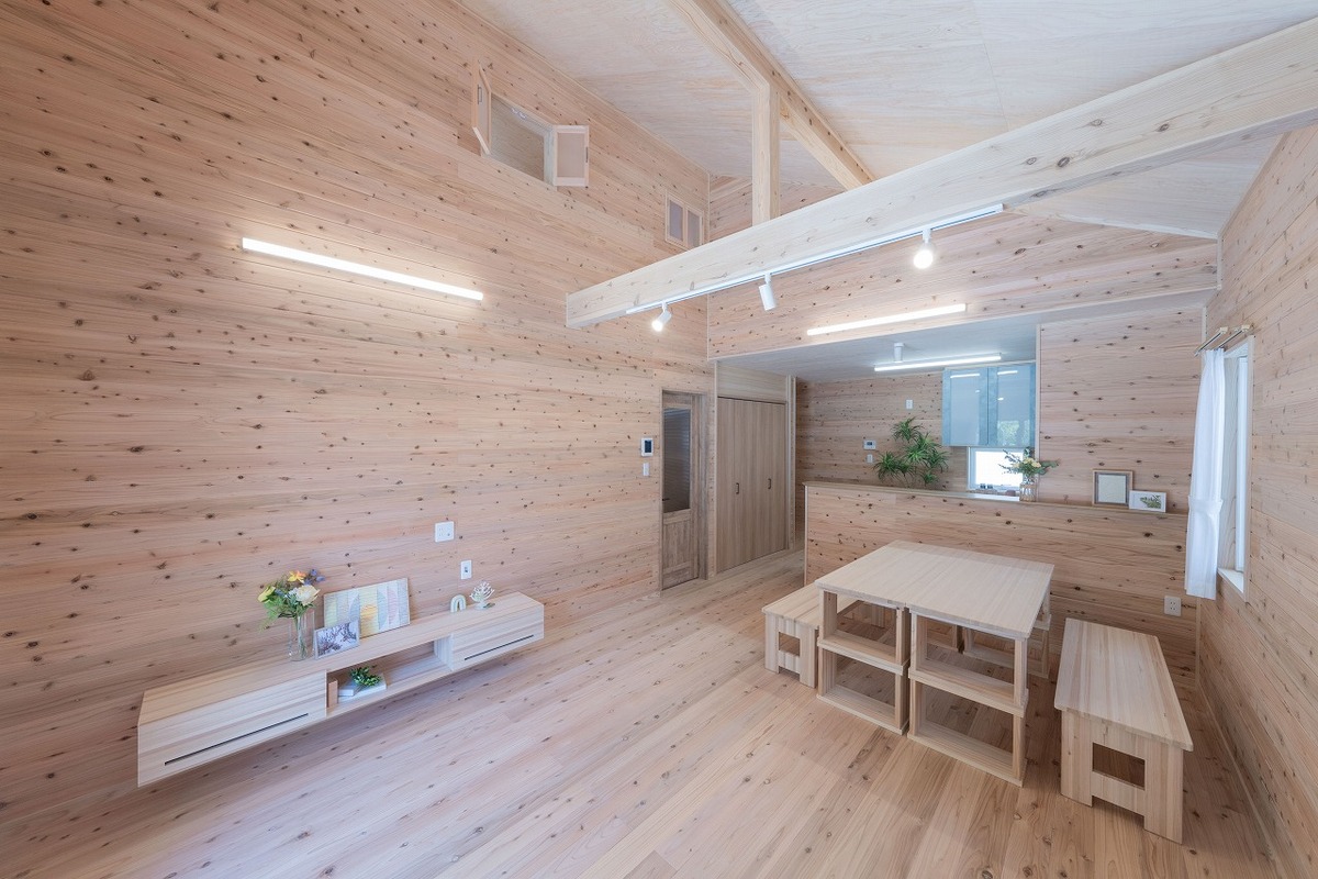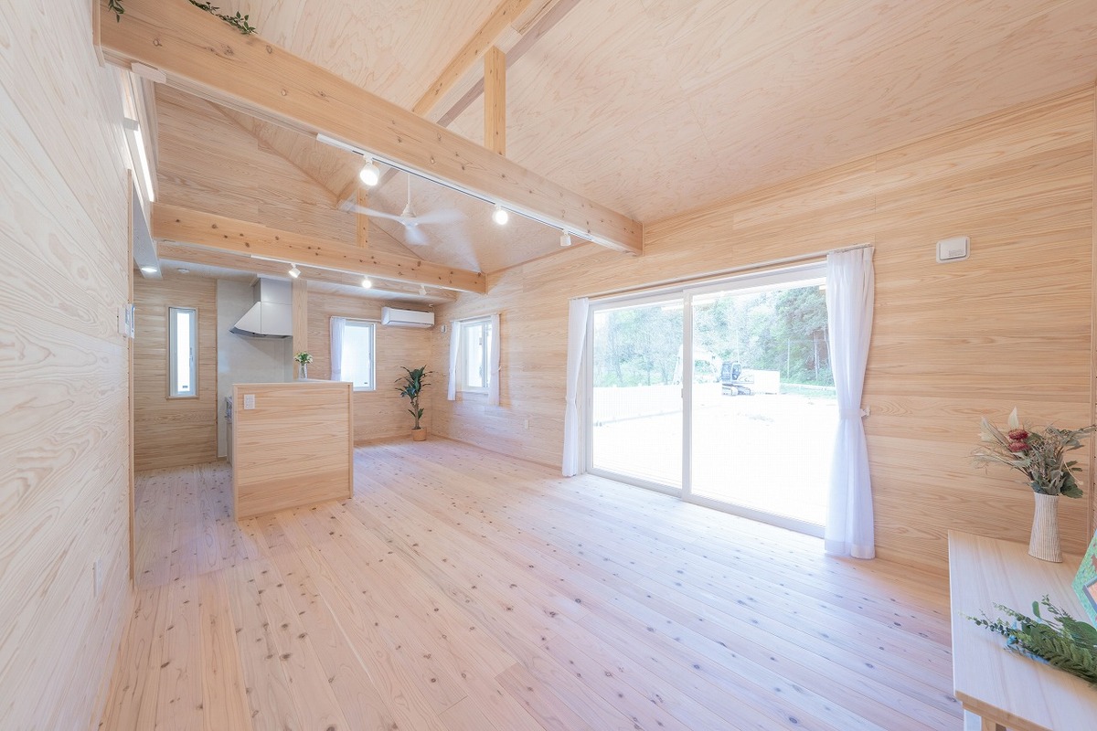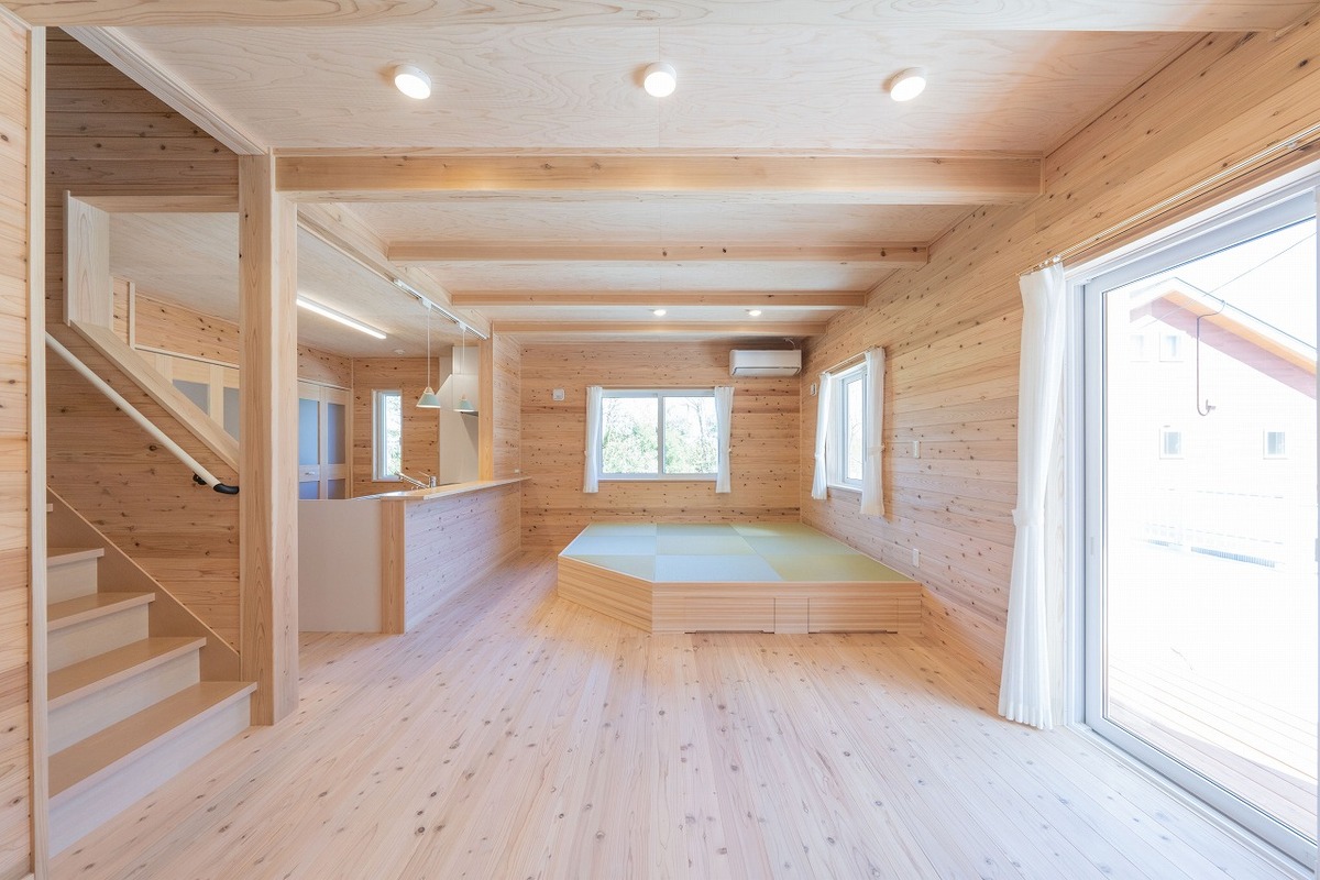 やさしい、落ち着く「木」の家。地域の無垢材でつくっています。夏はさらっとべたつかず、冬はひんやりしない、杉フローリングは素足がきもちいい!