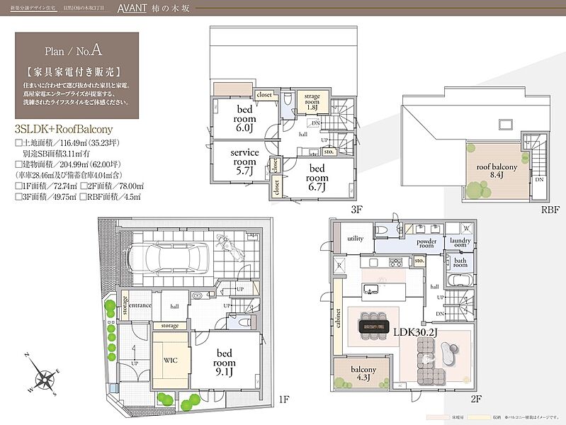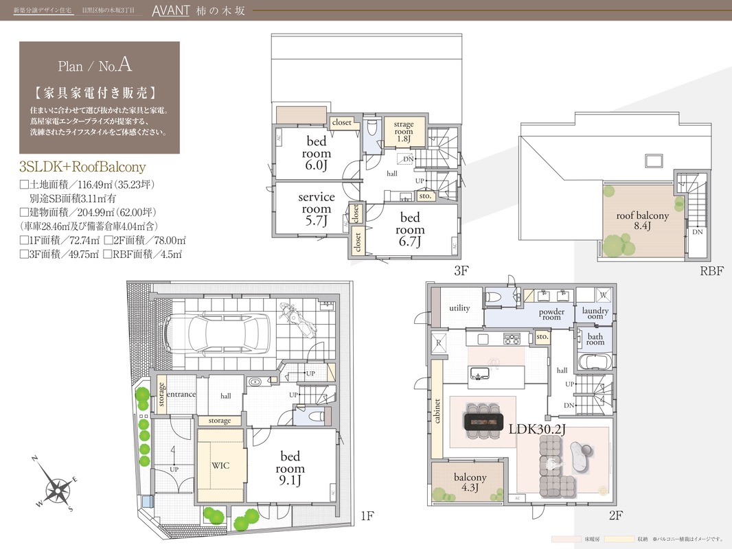 - 204.99m2 (A棟、車庫28.46m2及び備蓄倉庫4.04m2含)