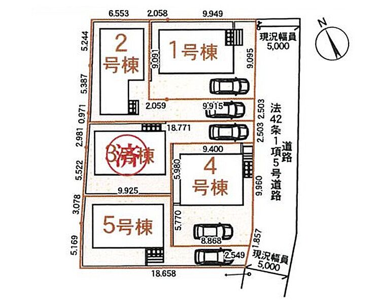 | 駐車場 | 1台 | 道路の幅員 | 4号棟:東5m /1号棟:東5m /5号棟:東5m /2号棟:東5m |