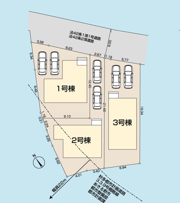 | 駐車場 | 2台 | 道路の幅員 | 2号棟:北西6m /1号棟:北西6m /3号棟:北西6m |