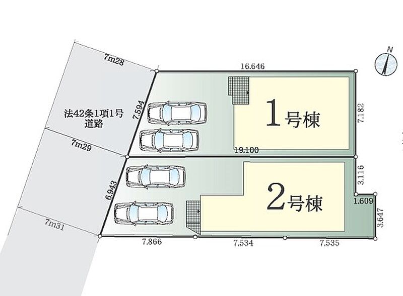| 駐車場 | 2台 | 道路の幅員 | 1号棟:西7.2m |