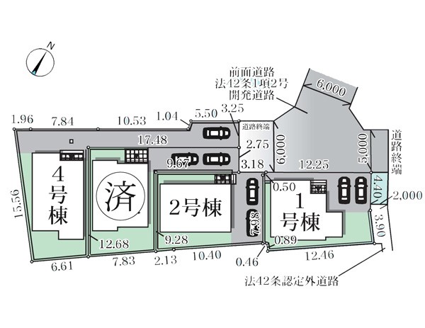 | 駐車場 | 2台 | 道路の幅員 | 1号棟:北6m |