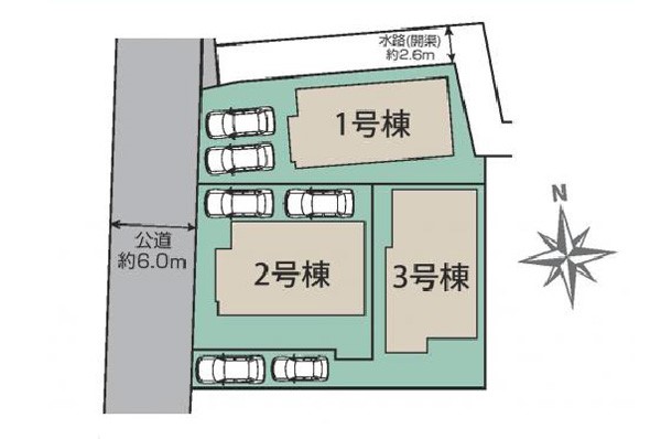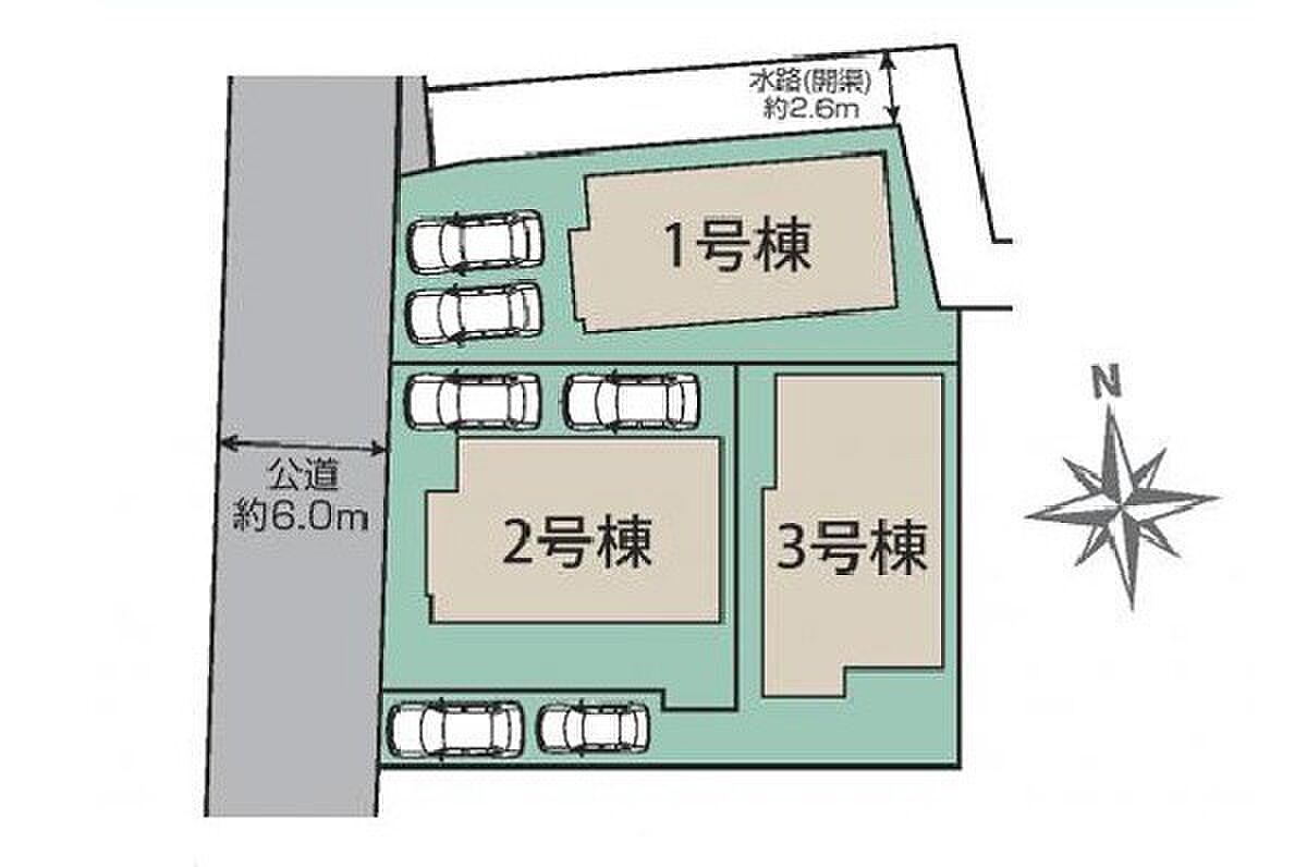 | 駐車場 | 2台 | 道路の幅員 | 1号棟:西6m |