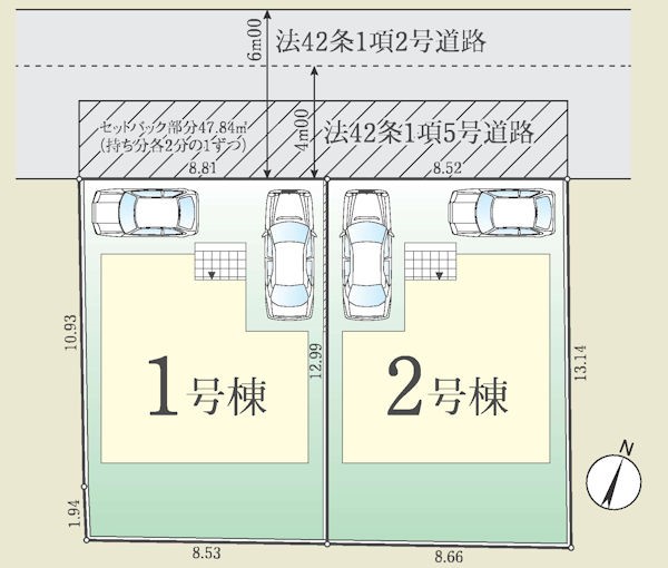 | 駐車場 | 2台 | 道路の幅員 | 2号棟:北西6m /1号棟:北西6m |