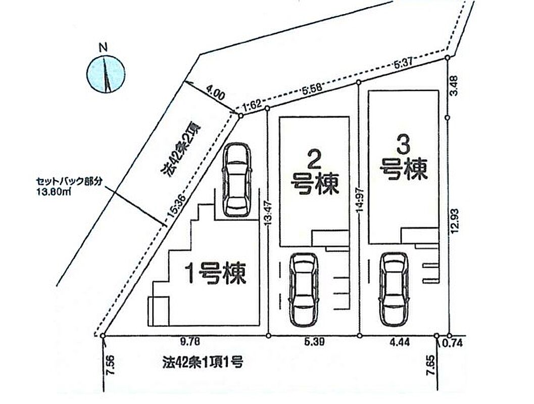 | 駐車場 | 1台 | 道路の幅員 | 1号棟:北西3m 南7.4m |