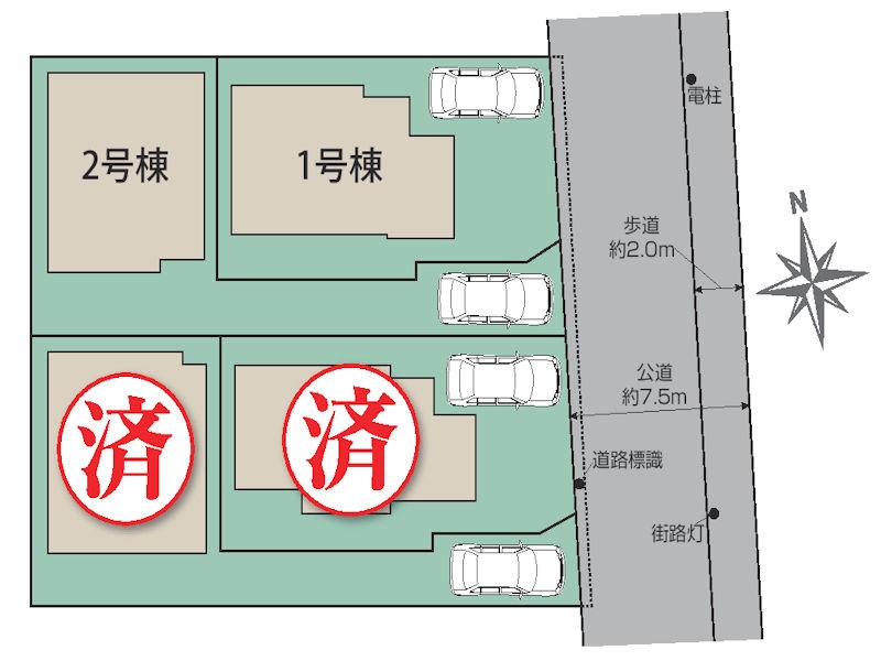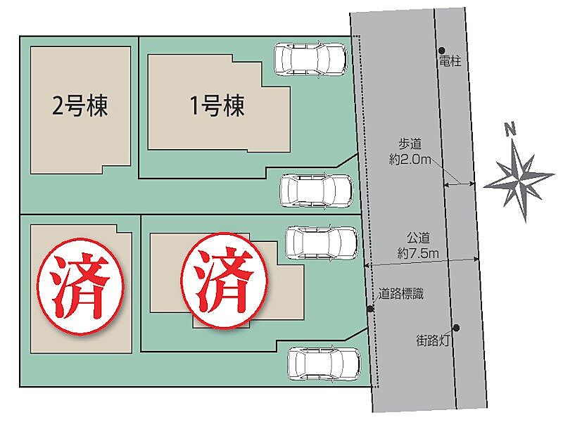 | 駐車場 | 1台 | 道路の幅員 | 1号棟:東7.5m |