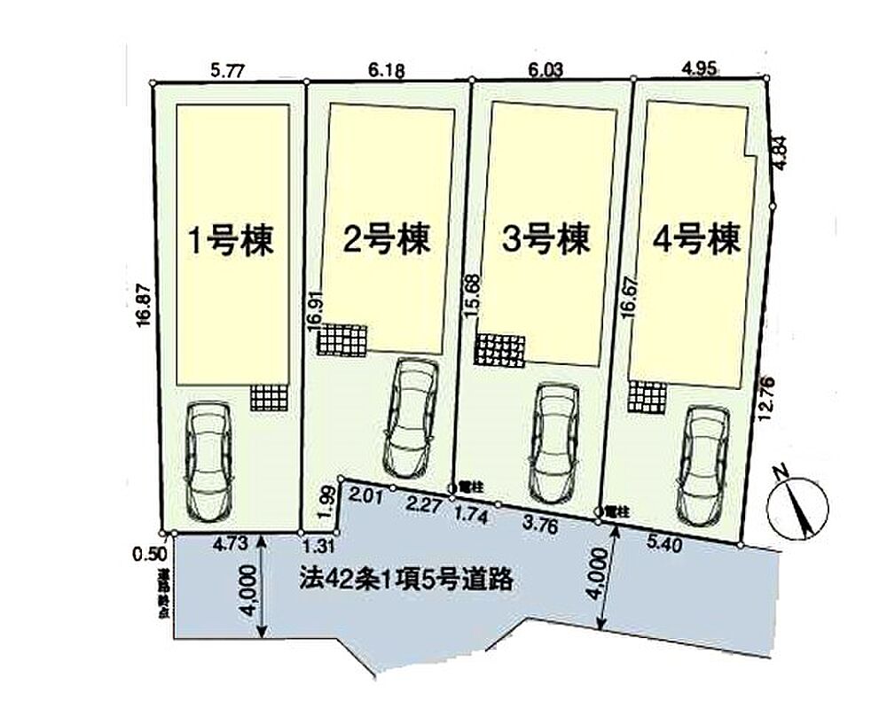 | 駐車場 | 1台 | 道路の幅員 | 1号棟:南4m /3号棟:南4m /4号棟:南4m /2号棟:南4m |
