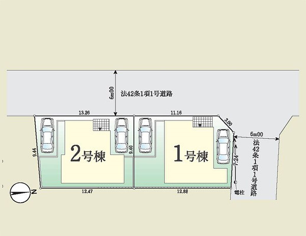 | 駐車場 | 2台 | 道路の幅員 | 1号棟:西6m 北6m |