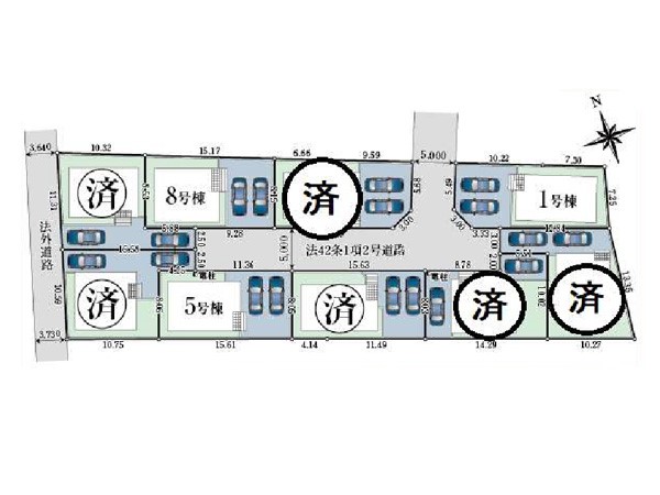 | 駐車場 | 2台 | 道路の幅員 | 1号棟:西5m /5号棟:北5m /8号棟:南5m |
