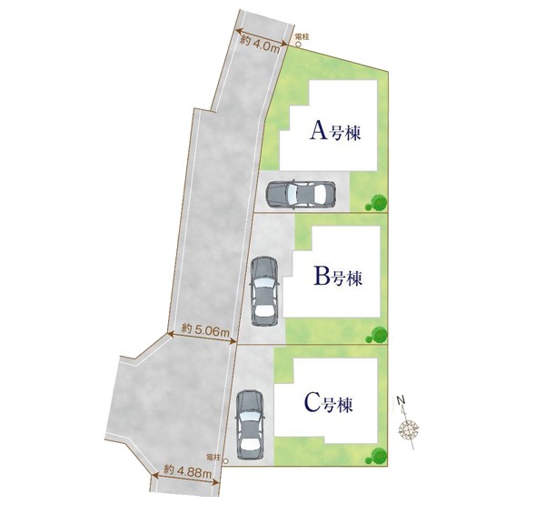 | 駐車場 | 1台 | 道路の幅員 | B号棟:西5m /A号棟:西4m /C号棟:西5m |
