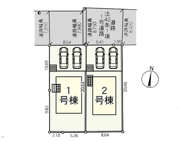 | 駐車場 | 2台 | 道路の幅員 | 1号棟:北7.9m /2号棟:北8.4m |