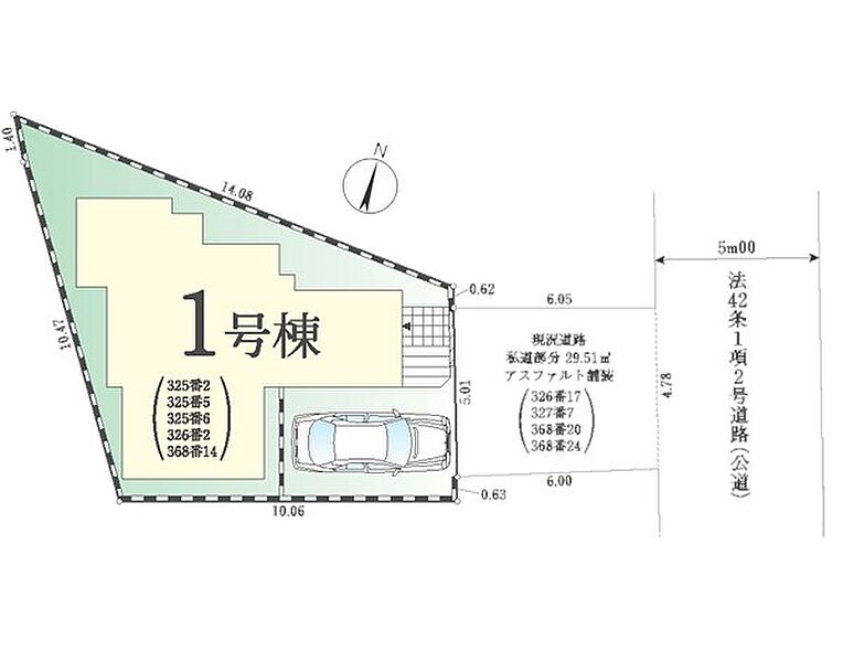 | 駐車場 | 1台 | 道路の幅員 | 1号棟:東5m |