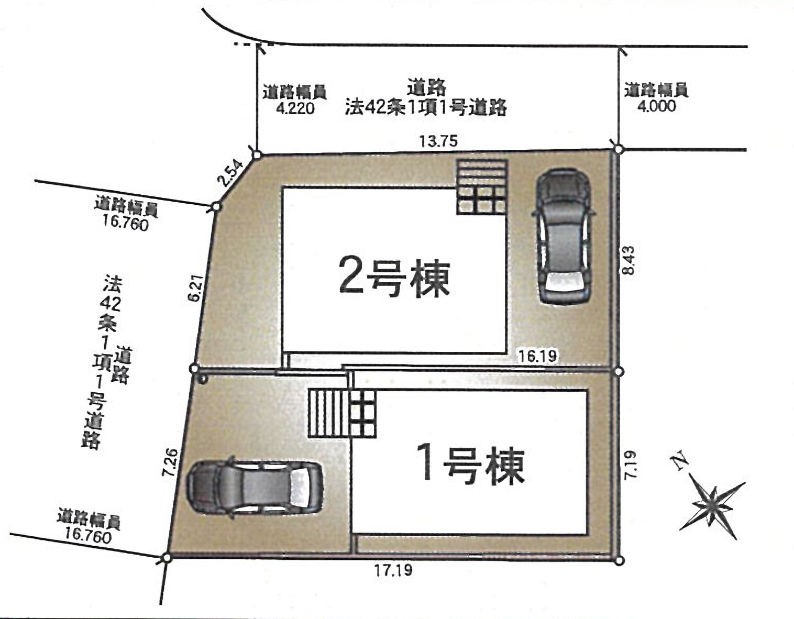 | 駐車場 | 1台 | 道路の幅員 | 1号棟:北西16.7m /2号棟:北東4m 北西16.7m |