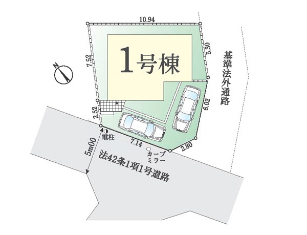 | 駐車場 | 2台 | 道路の幅員 | 1号棟:南西5m |