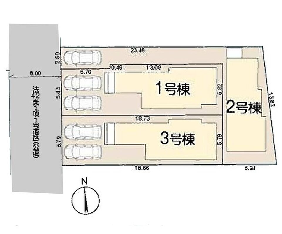 | 駐車場 | 2台 | 道路の幅員 | 1号棟:西6m /3号棟:西6m /2号棟:西6m |