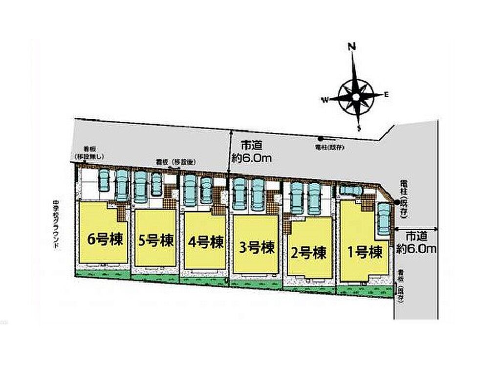 | 駐車場 | 2台 | 道路の幅員 | 2号棟:北6m /5号棟:北6m /6号棟:北6m /1号棟:北6m 東6m /4号棟:北6m /3号棟:北6m |