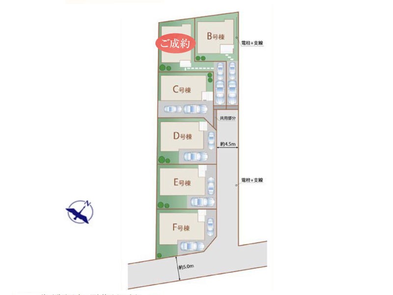 | 駐車場 | 2台 | 道路の幅員 | C号棟:北東4.5m /F号棟:北東4.5m 南東5m /B号棟:南東4.5m /D号棟:北東4.5m /E号棟:北東4.5m |