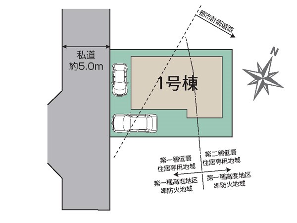 | 駐車場 | 2台 | 道路の幅員 | 1号棟:西5m |