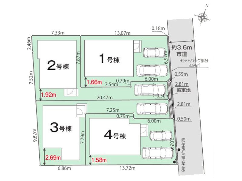 | 駐車場 | 2台 | 道路の幅員 | 1号棟:北東3.6m /3号棟:北東3.6m /4号棟:北東3.6m /2号棟:北東3.6m |