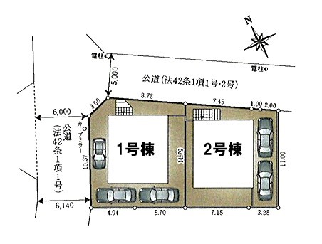 | 駐車場 | 3台 | 道路の幅員 | 1号棟:北東5m 北西6m /2号棟:北東5m 北西6m |