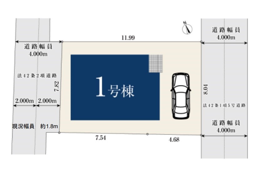 | 駐車場 | 1台 | 道路の幅員 | 1号棟:南東4m 北西1.8m |