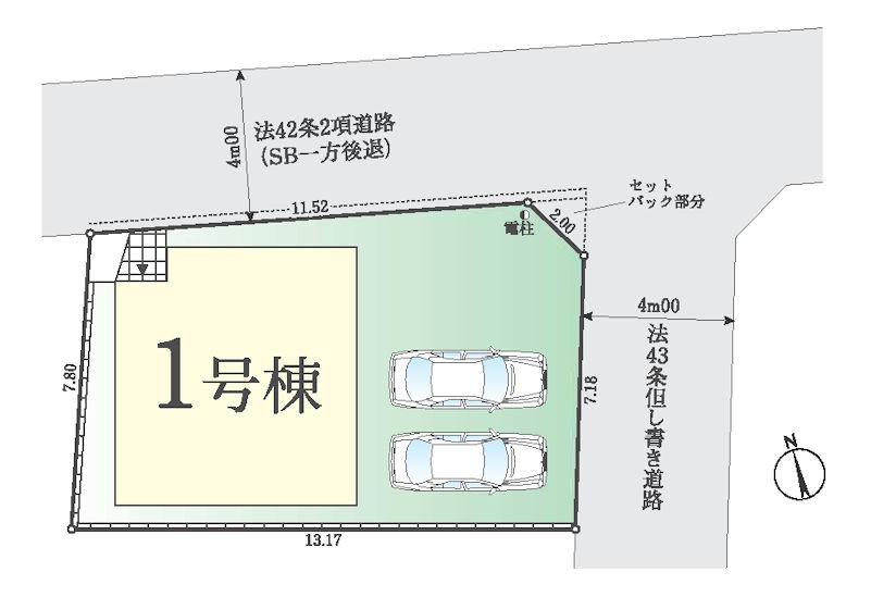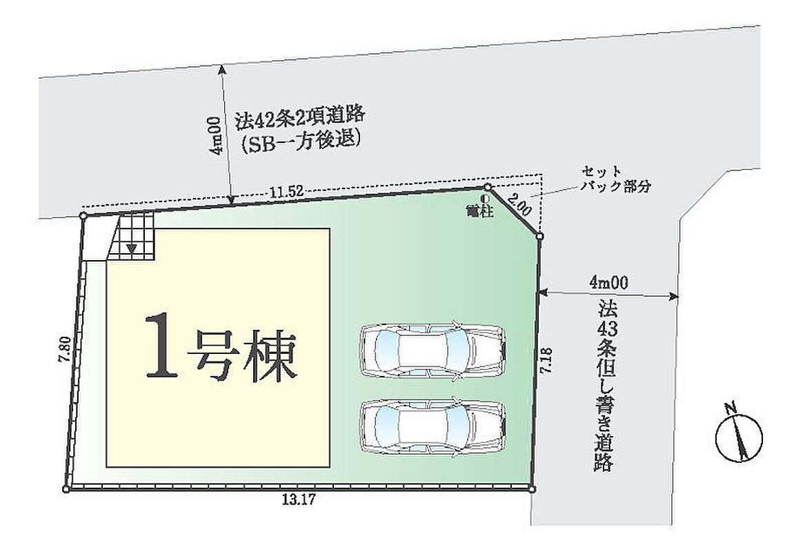 | 駐車場 | 2台 | 道路の幅員 | 1号棟:北4m 東4m |