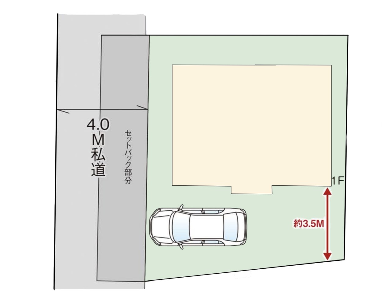 | 駐車場 | 1台 | 道路の幅員 | 1号棟:西4m |