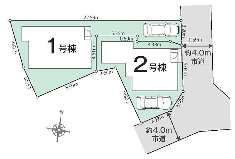 | 駐車場 | 1台 | 道路の幅員 | 1号棟:東4m /2号棟:東4m 南4m |
