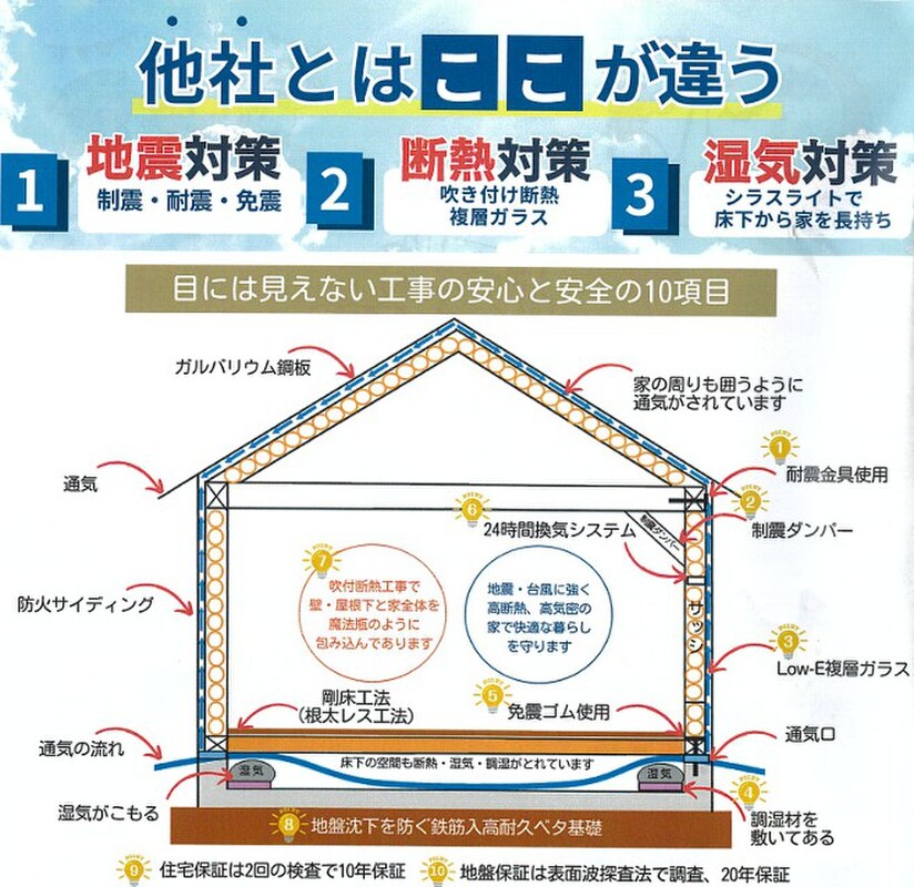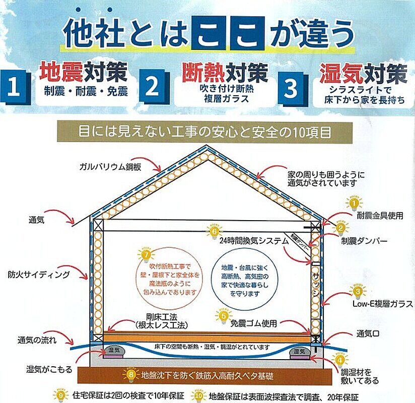 ●主要構造部に3重の耐震対策を採用。地震時の揺れを効果的に抑え、建物の損傷を低減! ●専用の床下処理で湿気やニオイをコントロール!住宅の劣化を遅らせるとともに衛生環境を保ちます