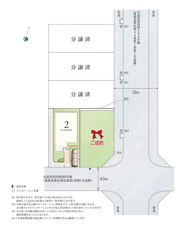 | 駐車場 | 2台 | 道路の幅員 | 2号棟:南6.5m |