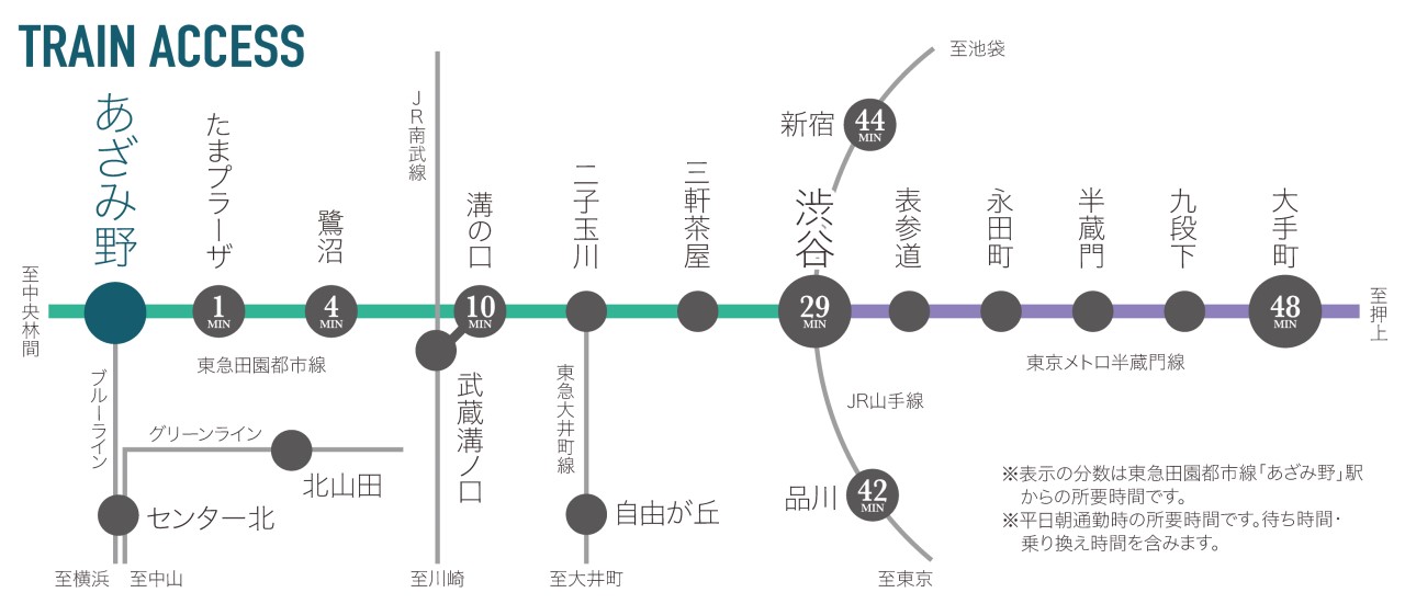 東急田園都市線「あざみ野」駅 徒歩21分 東急田園都市線「あざみ野」駅 東急バス乗車12分、大場中央停留所バス停下車 徒歩5分 |